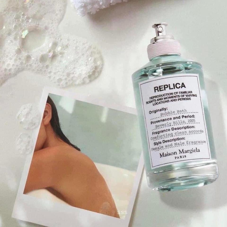 Nước Hoa Unisex Maison Martin Margiela Replica Bubble Bath- Bubble Bath của Maison Martin Margiela là một hương thơm Floral Woody Musk dành cho cả phụ nữ và nam giới. Khi ngửi mùi em này mình nghĩ ngay đến không gian ấm áp quen thuộc của phòng tắm, đem lại cảm giác sạch sẽ, tươi mát.Tựa như những cây nến thơm được đặt xung quanh, hoa Nhài, hoa Hồng và Lavender bằng cách nào đó chậm rãi len lỏi vào những ngóc ngách. Dịu nhẹ, thoải mái và bay bổng khiến cho người ta muốn đắm mình ngay vào trong mùi hương quyến rũ này.