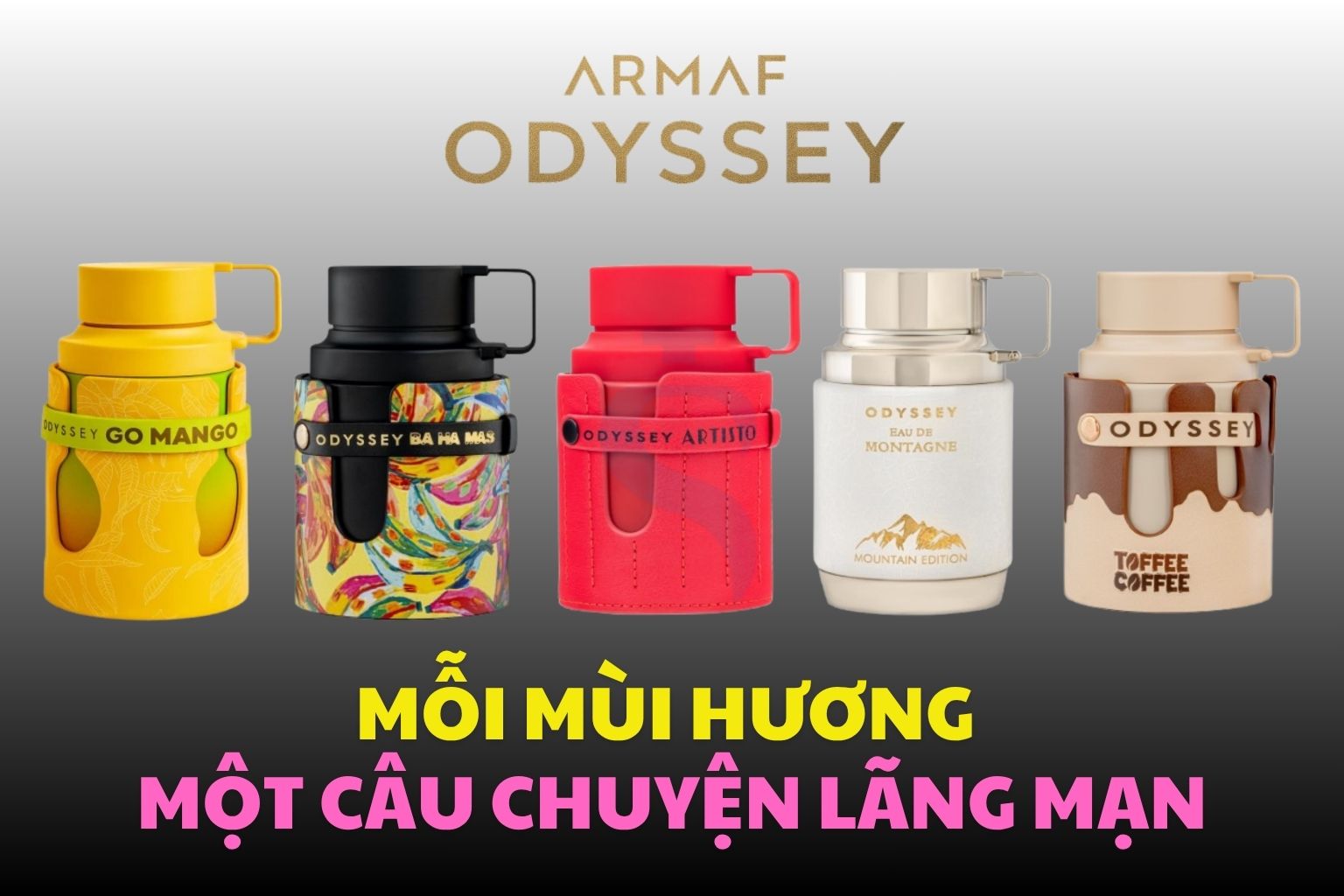 Trong bài viết này, chúng ta sẽ cùng khám phá 5 phiên bản: Go Mango, BA HA MAS, Artisto, Eau de Montagne, Toffee Coffee – mỗi chai đều mang cá tính riêng, nhưng đều thuộc “vườn” Odyssey, cho phép bạn lựa chọn theo mood, mùa và mục đích sử dụng.