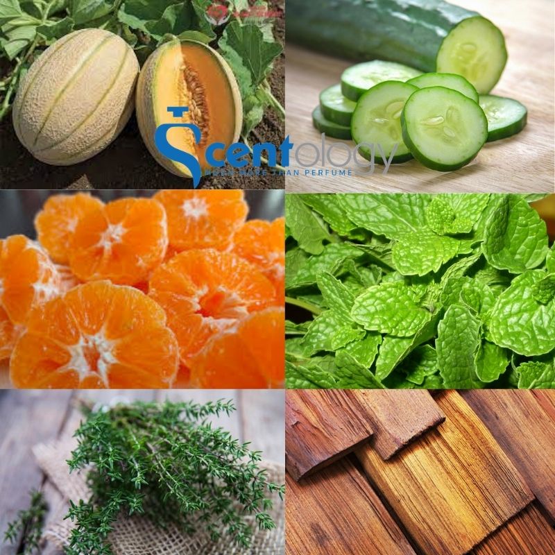 Dưa gang và dưa chuột chiếm rất nhiều ưu thế đi cùng với cam Mandarin ở hương vị ban đầu của cả hai chai, mang lại đầy sự ngọt ngào nhưng cũng rất tươi mát. Hương vị lại thôi thúc người dùng ở phần giữa chính là sự góp mặt đầy tinh tế của húng quế, xô thơm và hoa phong lữ. Và cuối cùng, mùi thơm của sự nam tính hiện lên bằng nốt hương nhẹ nhàng của xạ hương, gỗ thơm pha lẫn chút vị da lộn.